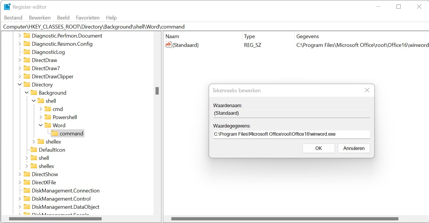 In het register ga je naar de sleutel HKEY_CLASSES_ROOT\Directory\Background\shell. Kies Bewerken / Nieuw / Sleutel. Geef de naam van het programma op, bijvoorbeeld Word. Kies nu Bewerken / Nieuw / Sleutel om een subsleutel toe te voegen. Deze noem je command. Dubbelklik op de sleutel en geef bij Waardegegevens het volledige pad en de naam van het programma op. In ons voorbeeld: C:\Program Files\Microsoft Office\root\Office16\winword.exe.
