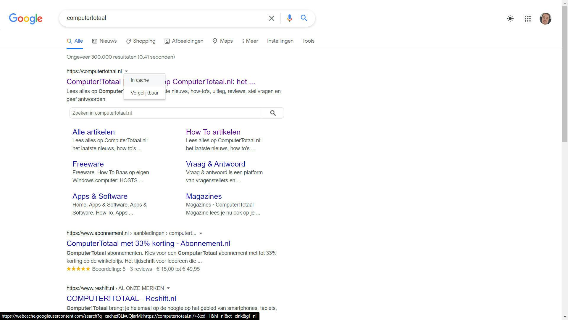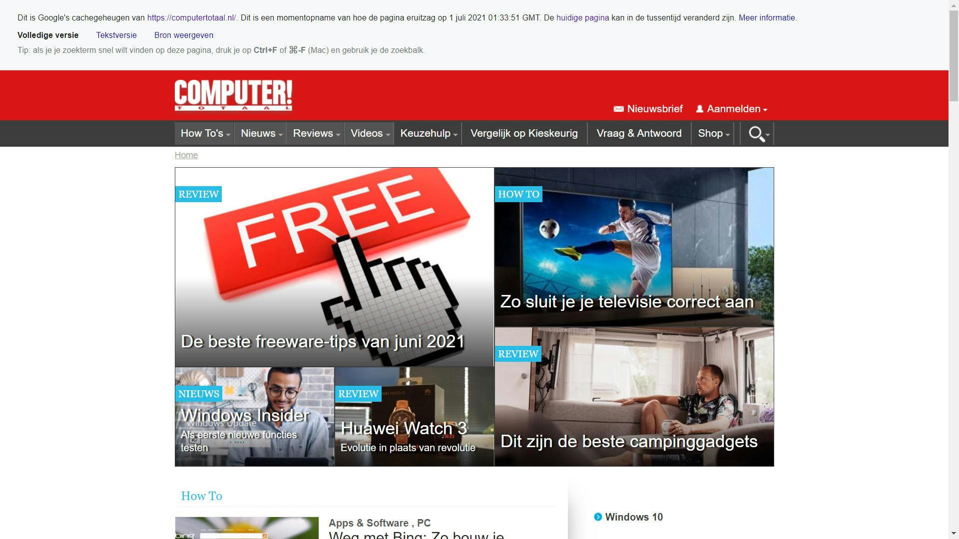 De eerste optie is heel simpel. Wanneer je bijvoorbeeld via Google of Bing een zoekopdracht uitvoert naar ‘computertotaal’ en op dat pijltje dat naar onderen wijst klikt, kom je uit in een klein menu waar In cache staat. Wanneer je daar dan op klikt, dan kom je uit op de meest recente cacheversie die de zoekmachine opgeslagen heeft. Bovenin staat dan onder meer de volgende tekst om aan te duiden dat het om een cacheversie van de pagina in kwestie gaat.