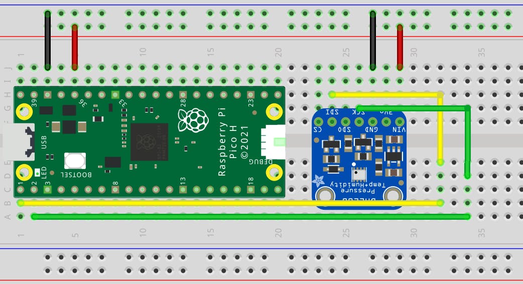 Op dezelfde manier kunnen we een temperatuursensor op de Raspberry Pi Pico aansluiten en die via usb zijn sensorwaardes aan de computer laten doorgeven. Voor de temperatuursensor kiezen we de populaire BME280 van Bosch in de uitvoering van Adafruit. Er bestaan ook goedkopere versies van Chinese fabrikanten. Controleer dan dat het om een I²C-versie gaat die op 3,3 V werkt.