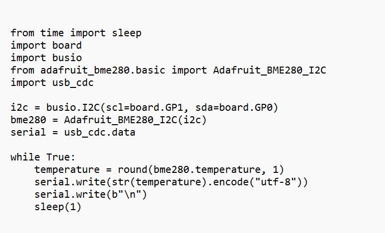 Eerst zetten we de I²C-bus op, waarbij we GPIO-pin 1 (GP1) als SCL definiëren en GPIO-pin 0 (GP0) als SDA. Daarna initialiseren we de driver voor de Adafruit BME280 en vragen we de dataverbinding voor de seriële interface op. Tot slot starten we in een oneindige lus het uitlezen van de temperatuur, ronden we die af op één cijfer na de komma en schrijven die naar de seriële interface, met telkens een seconde pauze tussen twee opeenvolgende metingen. Als je dit opslaat in code.py en dan op www.serialterminal.com in Chrome met je Pico verbindt, zie je de temperatuurmetingen over je scherm rollen. Dankzij de aanduiding "\n" (een newline) komt elke meting op een nieuwe regel.