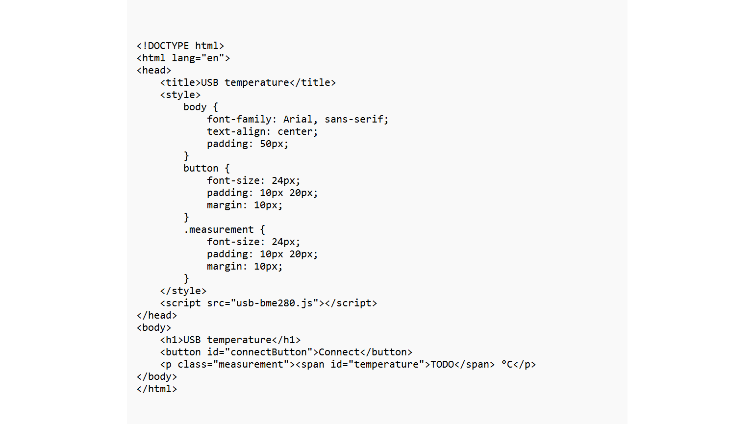 Deze bevat alleen een knop om de seriële verbinding op te zetten en een span-element dat de temperatuur toont. Het bijbehorende JavaScript-bestand usb-bme280.js is ook eenvoudig: