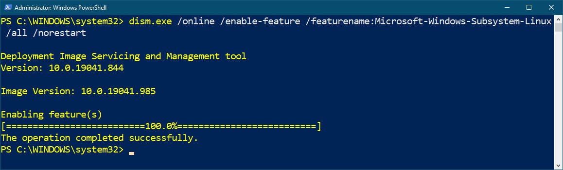 dism.exe /online /enable-feature /featurename:Microsoft-Windows-Subsystem-Linux /all /norestart