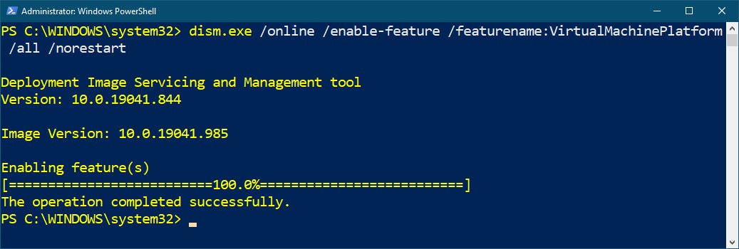 dism.exe /online /enable-feature /featurename:VirtualMachinePlatform /all /norestart