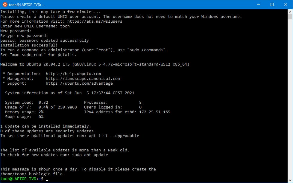 Klik dus maar op Ubuntu 20.04 LTS en druk op de knop Downloaden en vervolgens Installeren (ca. 450 MB). Na afloop druk je op de knop Starten, of je start Ubuntu 20.04 LTS op vanuit het Windows-startmenu. De eerste keer dat je een pas geïnstalleerde Linux-distro start, opent een consolevenster en moet je even wachten tot alle benodigde bestanden zijn uitgepakt op je systeem. Vervolgens wordt je om een new UNIX username gevraagd. Die hoeft niet dezelfde te zijn als je Windows-account, maar je gebruikt het best alleen kleine letters zonder spaties. Geef ook een wachtwoord op.