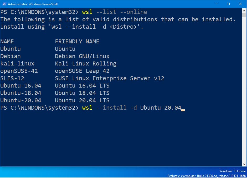Microsoft heeft onder de naam Windows Insider een programma opgezet voor gebruikers die willen deelnemen aan het uittesten van bèta Windows-builds. Je kunt je hiervoor inschrijven met je Microsoft-account via Windows Instellingen / Bijwerken en beveiliging / Windows Insider-programma. Je kunt uit een paar kanalen kiezen, maar als je (althans op het moment van schrijven) van enkele nieuwe WSL-functies gebruik wilt maken, zoals een vereenvoudigde installatie en ondersteuning van Linux GUI-applicaties, dan kies je het best voor het Dev-kanaal. We raden je wel af om dit op een productiemachine te doen. Beschik je over Insider Preview build 20246 of hoger, dan kun je WSL en de noodzakelijke componenten normaliter met één commando installeren vanuit PowerShell (uitvoeren als administrator): wsl --install. Hiermee installeer je zowel WSL, het VM-platform als Ubuntu. Wil je (ook) een andere distributie, voer dan eerst wsl --list --online uit. Je krijgt dan een overzicht van de beschikbare distro’s, die je dan als volgt installeert: *wsl --install -d
