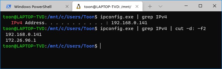 Hierbij wordt de uitvoer van het Windows-commando beperkt (grep) tot de regels met 'IPv4' en vervolgens worden de ongewenste kolommen weggeknipt (cut).