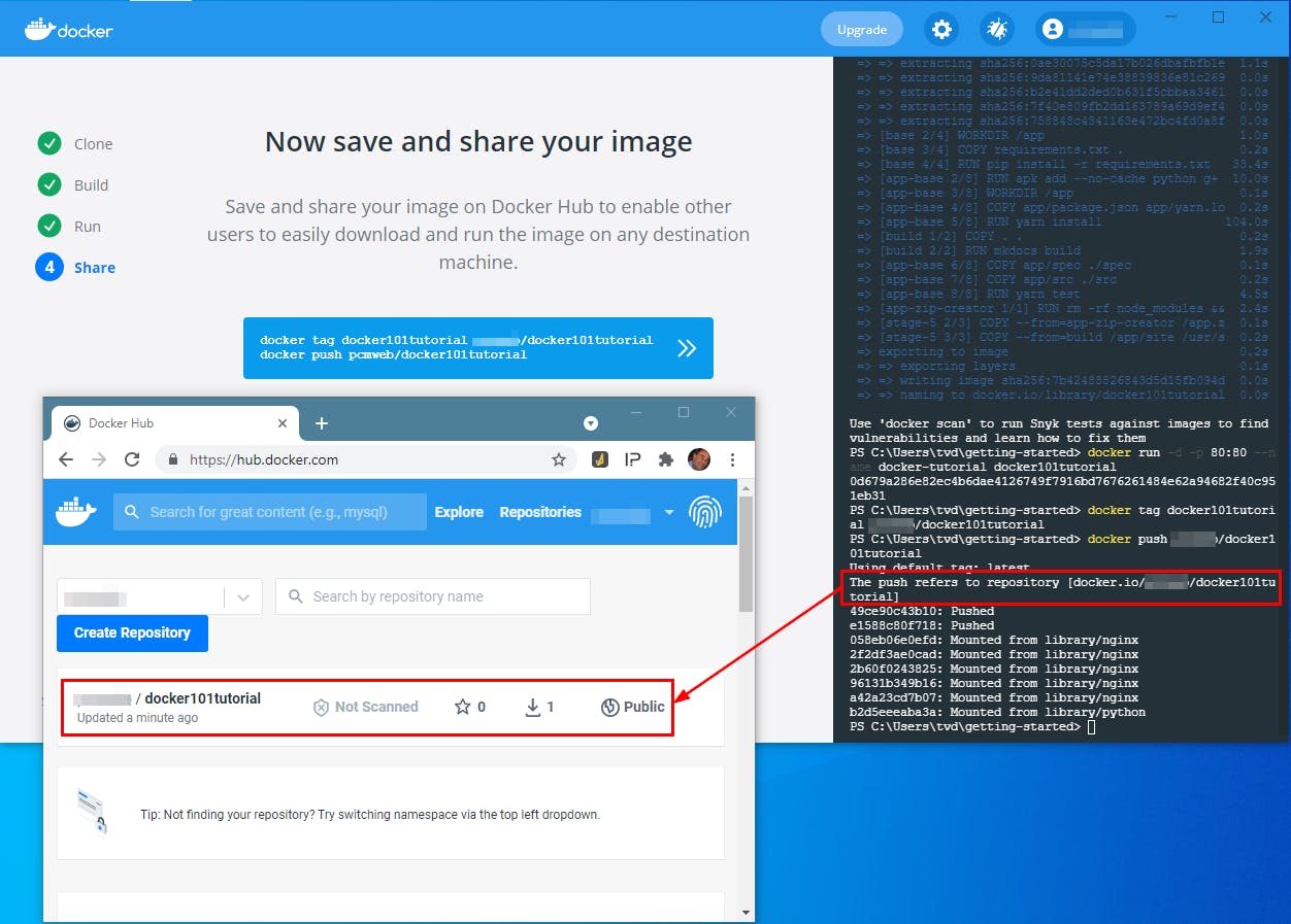 Het is overigens geen slecht idee om via de knop Start de tutorial te volgen. Die leidt je in vier stappen door het proces van het klonen van een repository, het bouwen van een image, het opstarten van een container en, na je aanmelding bij Docker Hub, het bewaren en delen van je image.
