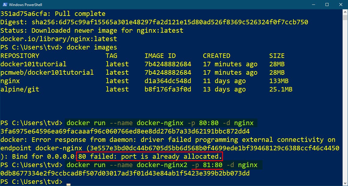 We zetten daarvoor Windows PowerShell in. Hier voer je het commando docker pull nginx uit. Na afloop tik je docker images in voor een lijst met images die op je pc beschikbaar zijn. Vervolgens creëer je een nieuwe container, gebaseerd op het gedownloade NGINX-Docker-image: