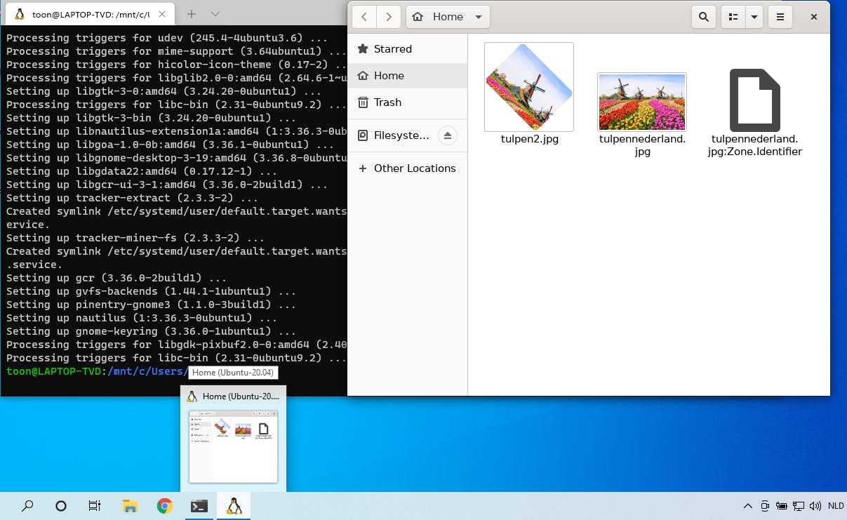 WSlg blijkt al behoorlijk goed geïntegreerd in Windows. Zo is het mogelijk om Linux-apps vanuit het Windows-startmenu op te starten. Ook kun je deze apps vastpinnen op de Windows-taakbalk. Met de toetscombinatie Alt+Tab schakel je snel om tussen opgestarte Windows- en Linux-applicaties, en ook het klembord wordt netjes gedeeld.