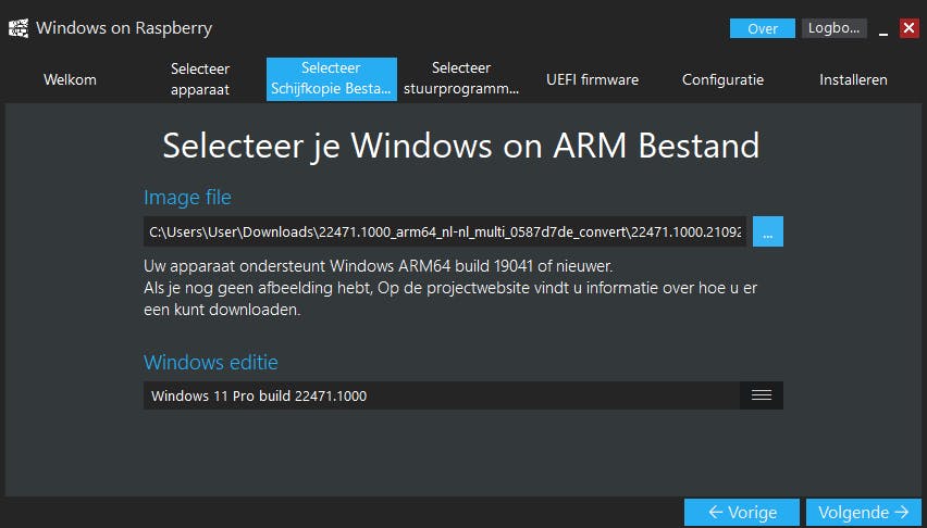 Selecteer in de volgende stap het Windows-imagebestand dat je eerder hebt gegenereerd en selecteer de Windows-editie (bijvoorbeeld Home of Pro) waarvoor je een licentiesleutel hebt. Daarna kies je de stuurprogramma’s voor je Raspberry Pi. Kies de eerste optie Gebruik het nieuwste pakket dat beschikbaar is op de server om ze te downloaden. Selecteer dezelfde optie in de stap erna voor de UEFI-firmware.