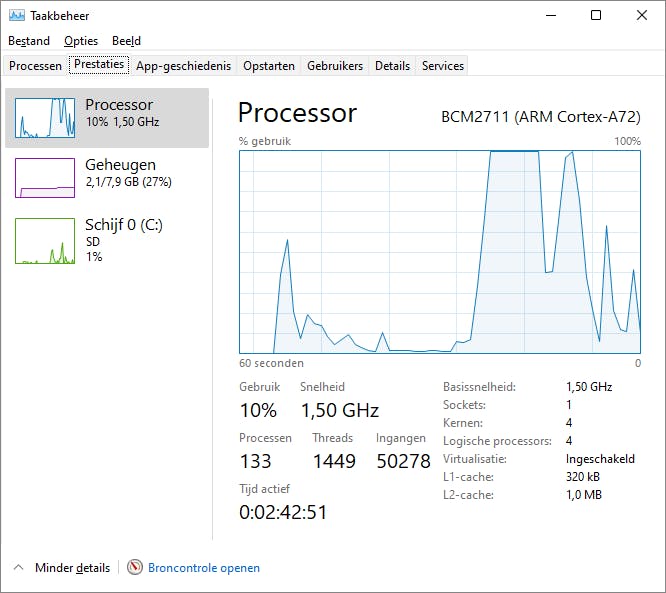 Op een Raspberry Pi 4 met 8 GB geheugen werkt dit allemaal vrij vlot. Zie het kader ‘Meer geheugen op de Raspberry Pi 4’, want het geheugen is standaard gelimiteerd tot 3 GB. Voor specifieke monitoring van de Raspberry Pi-hardware kun je ook het programma PiMon draaien.