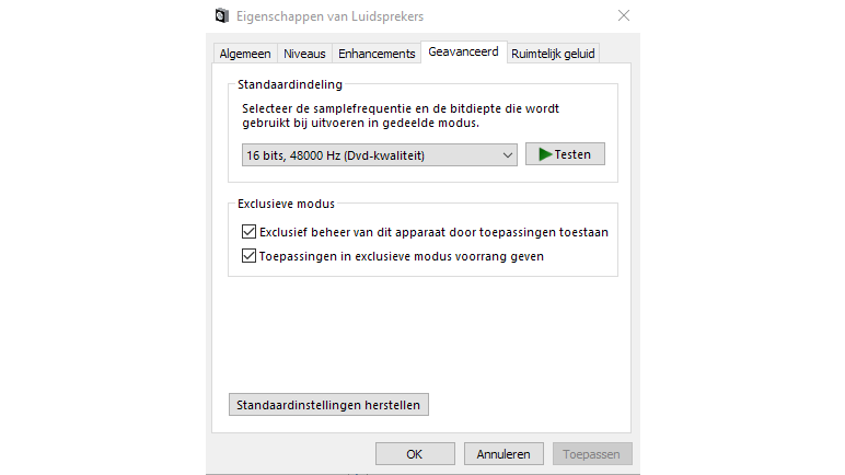 Werk je in Windows 10, dan gebruik je het zoekvak om het Configuratiescherm te openen en ga je naar Geluid. In beide gevallen kom je bij een pop-upvenster waar je het tabblad Afspelen opent. Dubbelklik op het geselecteerde afspeelapparaat (dat herken je aan een groen vinkje). Of selecteer de eigenschappen ervan door er met de rechtermuisknop op te klikken of door op de knop Eigenschappen te gebruiken. Navigeer in het nieuwe pop-upvenster naar het tabblad Geavanceerd en klik op Standaardinstellingen herstellen onder aan het venster. Hierdoor worden de samplefrequentie, bitsnelheid, audioverbeteringen en hardwareversnelling opnieuw ingesteld. Je kunt ze trouwens proberen met de knop Test. Wanneer het audioapparaat al in de standaardconfiguratie staat, wordt de knop Standaardinstellingen herstellen lichtgrijs weergegeven.