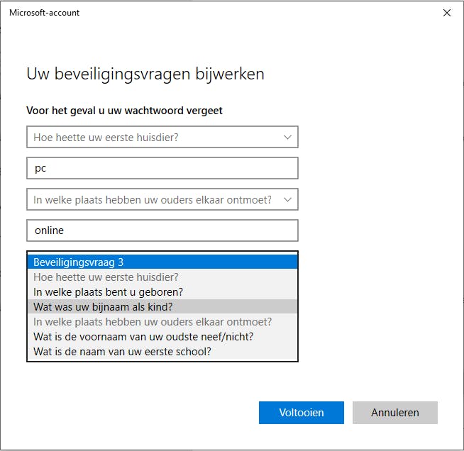 Je kunt deze beveiligingsvragen overigens op elk moment aanpassen via Instellingen, Accounts, Aanmeldingsopties. Hier klik je op Wachtwoord en op Beveiligingsvragen bijwerken. Nadat je er drie hebt geselecteerd en beantwoord, bevestig je met Voltooien.