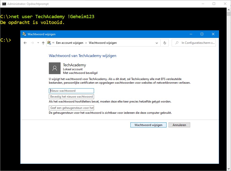 Open het Configuratiescherm, klik op Gebruikersaccounts (2x) en kies Een ander account beheren. Selecteer het betreffende account, kies Het wachtwoord wijzigen en geef een nieuw wachtwoord op (2x), en ook een geheugensteun. Of open het Windows-startmenu, klik met rechts op Opdrachtprompt en kies Als administrator uitvoeren. Geef daarna het volgende commando: net user <accountnaam> <nieuw_wachtwoord> . Dat wordt dus zoiets: net user ComputerTotaal !Geheim123.