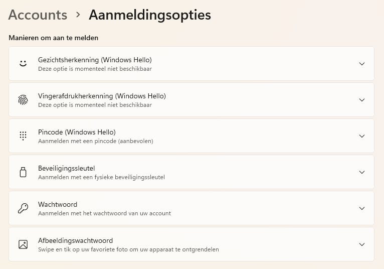 Ben je je wachtwoord niet vergeten, maar wil je het wel veranderen? Ga dan via het startmenu in Windows 11 naar de Instellingen-app. In het menu links vind je de optie Accounts. Klik daarop en ga naar Aanmeldingsopties. In dit menu vind je verschillende manieren om in te loggen op je computer, namelijk via een wachtwoord, pincode, beveiligingssleutel of gezichtsherkenning (Windows Hello).