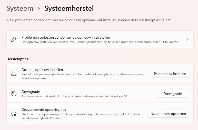 Ga naar de Instellingen-app en klik in het menu links op Systeem. Scrol naar beneden en ga naar Systeemherstel. Daar vind je de optie Geavanceerde opstartopties. Zodra je hier kiest voor Nu opnieuw opstarten dan wordt je pc opnieuw gestart en kom je direct in het blauwe opstartmenu van Windows 11. Kies hier voor de optie Problemen oplossen en daarna voor Geavanceerde opties en Instellingen voor UEFI-firmware. UEFI is eigenlijk de opvolger van BIOS, maar beide termen worden vaak door elkaar gebruikt. Klik op Opnieuw opstarten om je computer opnieuw op te starten en direct naar het BIOS te gaan.