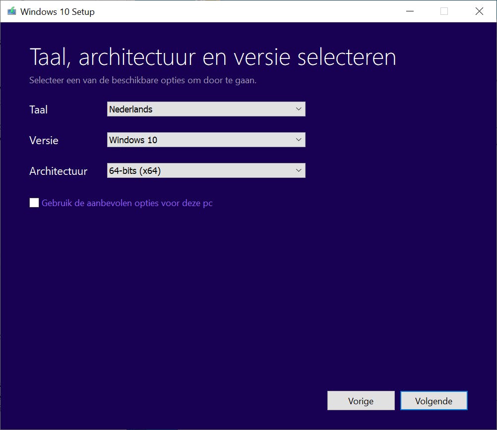 In het volgende scherm geef je aan welke versie van Windows je wilt downloaden. Het hulpprogramma heeft zelf de standaardopties al geselecteerd. Wil je zelf kiezen, haal dan het vinkje weg bij de optie Gebruik de aanbevolen opties voor deze pc. Geef bij Taal de gewenste taalversie op en kies bij Architectuur voor de 32- of 64-bit versie. Wij kiezen voor de 64-bits editie. Tevreden met de selectie? Klik op Volgende. In het venster hierna bepaal je dat Windows als iso-bestand moet worden binnengehaald. Kies daarom voor de tweede optie – ISO-bestand – en klik op Volgende. Geef een opslaglocatie voor het bestand op en kies Opslaan. De locatie heb je straks nodig om aan WinToUSB aan te geven waar Windows klaarstaat. De Windows-versie wordt binnengehaald en opgeslagen als iso.