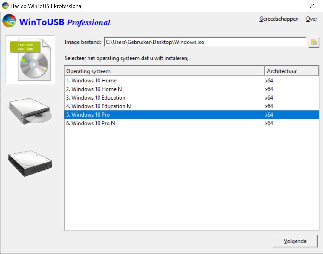 Het programma is opgebouwd uit twee onderdelen. Links vind je drie knoppen, voor drie manieren waarop je Windows op een usb-stick kunt plaatsen: via een iso-bestand, via een installatie-dvd of via een harde schijf. Wij klikken op de eerste knop. In het rechterdeel van het venster geef je aan waar het iso-bestand zich bevindt. Klik op de knop Bladeren en wijs het iso-bestand aan. Een iso-bestand kan meerdere Windows-versies bevatten. WinToUSB opent het bestand dan ook en controleert welke Windows-versies je ermee kunt installeren. Een lijst verschijnt met beschikbare installaties (in het gedeelte Selecteer het operating systeem dat u wilt installeren. Selecteer de Windows-versie die je op de usb-stick wilt plaatsen (bijvoorbeeld Windows 10 Home) en klik op Volgende.