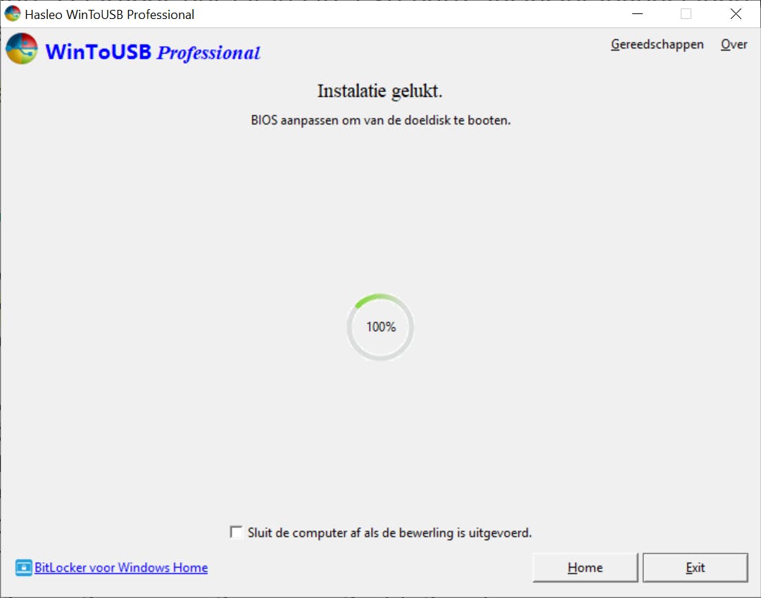 Nu is het tijd om je portable installatie van Windows te testen. Sluit de externe usb-stick of externe schijf aan op de computer en start de computer opnieuw op. Deze moet nu opstarten vanaf het externe medium. Word de schijf niet gestart, controleer dan de opstartvolgorde van apparaten in het bios van de computer en controleer of je de juiste opstartpartitie hebt aangemaakt en geselecteerd.