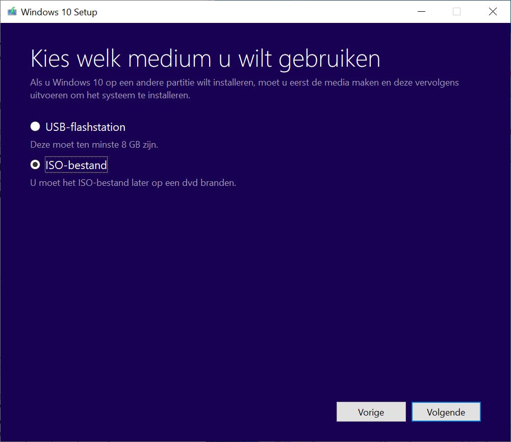 Microsoft heeft het iso-bestand van Windows 10 online geplaatst. Je kunt dit downloaden via een hulpprogramma. Ga de site van Microsoft en klik op de knop Hulpprogramma nu downloaden. Start het programma en klik op Volgende. Nadat je akkoord bent gegaan met de gebruiksvoorwaarden, kies je in het volgende scherm voor Installatiemedia (USB-stick, dvd of ISO-bestand) voor een andere pc maken. Klik op Volgende.