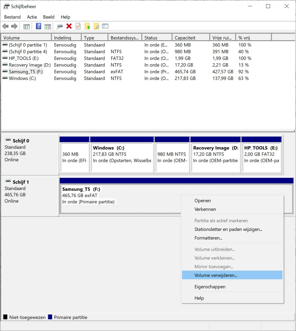 In het bovenste gedeelte van het venster vind je een overzicht van beschikbare schijven. Hiertussen vind je ook de harde schijf van de computer. Zoek nu naar de usb-stick en selecteer deze. Klik met de rechtermuisknop op de partitie (onderin het venster) en kies voor Volume verwijderen. Zorg ervoor dat alle partities zijn verwijderd.