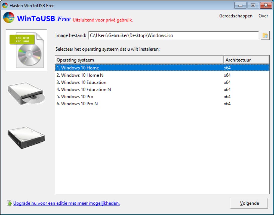 Een iso-bestand kan meerdere Windows-versies bevatten. WinToUSB opent het bestand dan ook en controleert welke Windows-versies je ermee kunt installeren. Een lijst verschijnt met beschikbare installaties (in het gedeelte Selecteer het operating systeem dat u wilt installeren. Selecteer de Windows-versie die je op de usb-stick wilt plaatsen (bijvoorbeeld Windows 10 Home) en klik op Volgende.