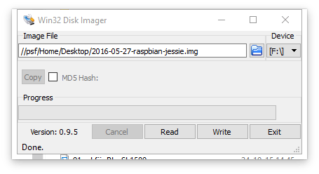 Download het programma Win32DiskImager, installeer het en open het programma. Sluit de SD-kaart aan op je pc en controleer welke schijfletter de SD-kaart krijgt toegewezen. In DiskImager kijk je of de juiste letter wordt getoond en open je het Raspbian disk-image door op het mapje naast de letter te klikken. Klik op Write om het image naar de SD-kaart te kopiëren. Bevestig de actie door op Yes te klikken. Het schrijven van het besturingssysteem kan een paar minuten duren. Als het bericht Write Successful verschijnt, klik je op OK en haal je de SD-kaart uit je pc.