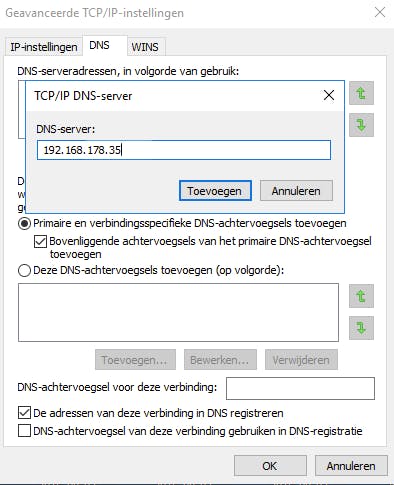 In Windows 10 ga je naar het configuratiescherm en klik je op Netwerk en Internet / Netwerkcentrum. Klik op Adapterinstellingen wijzigen. Klik met je rechtermuisknop op de verbinding die je wilt wijzigen en selecteer Eigenschappen. Zorg dat je in het tabblad Netwerken bent en selecteer Internet Protocol versie 4. Klik op Eigenschappen / Geavanceerd. Kies het tabblad DNS en voeg het IP-adres van je Pi-hole toe door op Toevoegen te klikken. Sluit af met OK en vergeet deze stappen niet ook bij je eventuele andere netwerkverbindingen te doen.