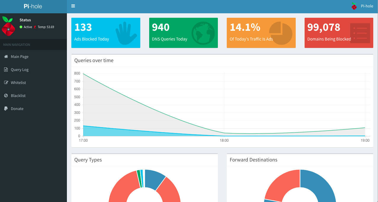 Ga in je browser naar het IP-adres van je Pi-hole en typ achter het IP-adres /admin. Dit is de configuratiepagina van je Pi-hole. Je ziet hoeveel reclame vandaag al is tegengehouden, hoeveel domeinen geblokkeerd zijn en welke apparaten welke aanvragen hebben gedaan. Onder Top Advertisers zie je van welke domeinen de meeste reclames worden geblokkeerd. Bij Query Log vind je een overzicht van al je internetverkeer, helaas kun je dit niet uitschakelen of bepaalde entries verwijderen.