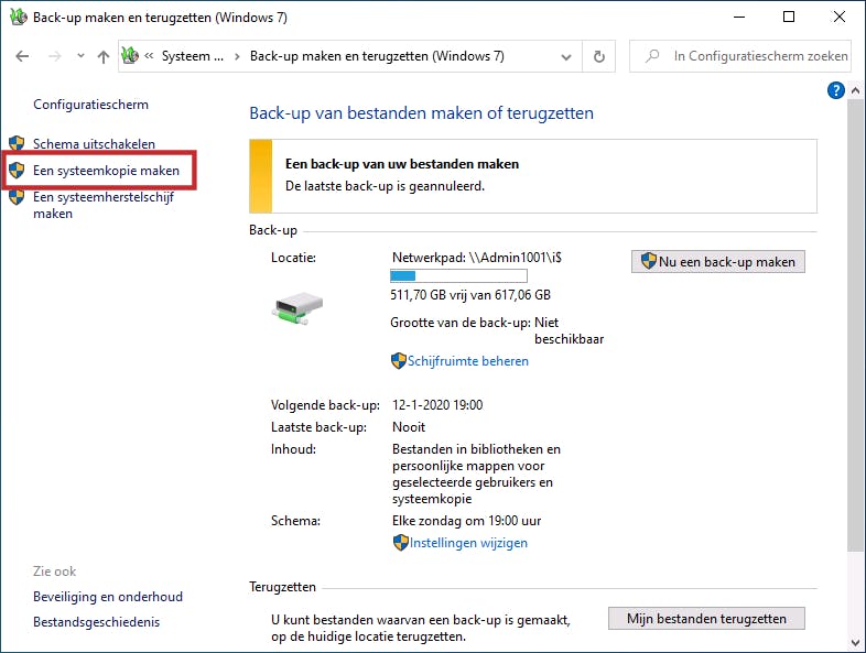 In dit voorbeeld maken we gebruik van een nas om de back-up van de systeemkopie op te slaan, maar de stappen voor het maken van een systeemkopie op een externe harde schijf (de eerste optie in de lijst) zijn vrijwel gelijk. We kiezen nu voor de optie Op een netwerklocatie. Via de knop Selecteren blader je vervolgens naar een netwerklocatie.