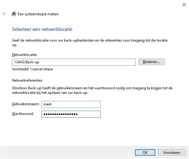 Jammer genoeg is het niet zo dat je eenvoudig met een bladerknop door je netwerk kunt zoeken. Je moet namelijk het directe netwerkpad weten waar je de systeemkopie hebt opgeslagen. Een netwerkpad is een combinatie van een apparaatnaam (bijvoorbeeld een nas of een computer) en een map op dat apparaat. Een netwerkpad begint altijd met twee backslashes, gevolgd door de naam van het apparaat, vervolgens weer een backslash en dan de naam van de map. Bijvoorbeeld: \\mijn-netwerk-nas\backup.