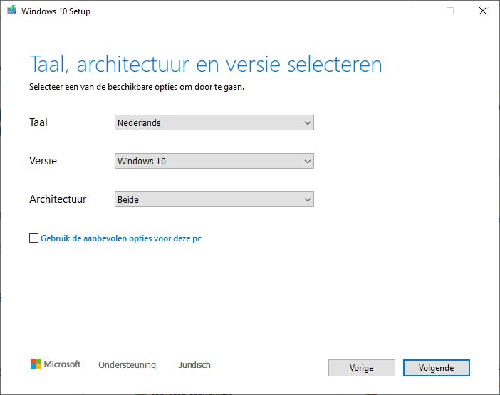 Plaats een usb-stick van minimaal 8 GB in je computer en druk op de knop Volgende. Bij Taal, architectuur en versie selecteren laat je – als de computer waarop je de stick maakt ook de computer is waarvan je een systeemkopie wilt terugzetten – de optie staan op Gebruik de aanbevolen opties voor deze pc. Maak je de usb-stick op een andere computer dan degene die je wilt herstellen, haal dan het vinkje weg en kies bij Architectuur voor Beide, als je niet zeker weet welke versie van Windows 10 het is die je gaat herstellen.
