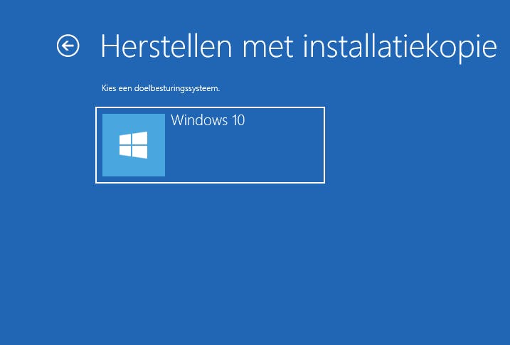 Er verschijnt weer een nieuw scherm met allerlei opties. Als laatste optie zie je Herstellen met installatiekopie staan. Die optie kies je om een eerder gemaakte systeemkopie terug te zetten. Er verschijnt weer een nieuw venster. Dit geeft aan welk besturingssysteem je wilt gaan herstellen met de systeemkopie. Als je meerdere besturingssystemen naast elkaar hebt geïnstalleerd, bijvoorbeeld Windows 7 en Windows 10, dan kan het zijn dat je in dit venster twee besturingssystemen ziet staan. In dat geval kies je dan voor Windows 10, aangezien dat het besturingssysteem is waarvan je een systeemkopie wilt terugzetten.