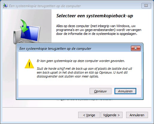 Heb je geen externe harde schijf gebruikt maar een netwerklocatie, of kan Windows 10 de systeemkopie nog niet vinden, klik dan op Annuleren. Geen nood: de herstelconsole wordt hier niet mee afgesloten, maar je sluit alleen het bovenliggende venster. In het venster Selecteer een systeemkopieback-up kun je straks zelf bladeren naar de locatie van de gemaakte systeemkopie.