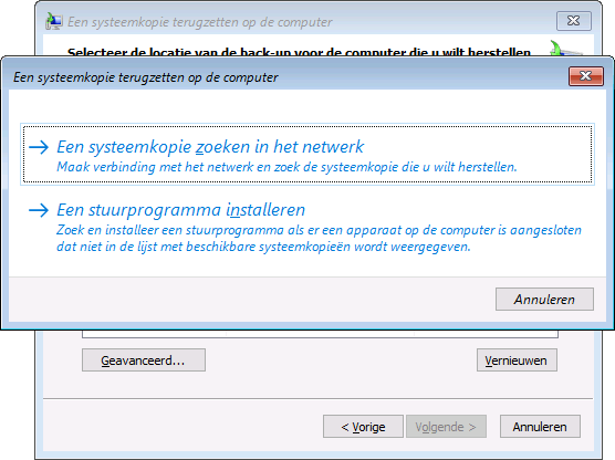 Als de hersteltool hier geen bestaande systeemkopie kan vinden, zijn de velden bij Locatie, Datum en tijd en Computer leeg. Via een druk op de knop Volgende komt er wederom een scherm waarin geen back-ups te zien zijn in het overzicht, maar je kunt hier nu wel via de knop Geavanceerd alsnog een locatie opgeven. Kies uit de twee keuzes die je krijgt voor de optie Een systeemkopie zoeken in het netwerk. Op die manier kun je bladeren naar bijvoorbeeld een nas of een map op een andere computer die gedeeld is in het thuisnetwerk.