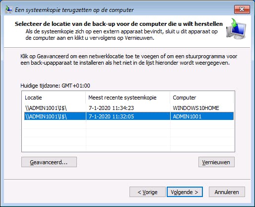 Let op, het navigeren door de velden doe je in dit scherm via de pijltjestoetsen. Dus heb je een gebruikersnaam ingevuld, dan druk je op PijltjeOmlaag om in het wachtwoordveld te komen. Heb je je gebruikersnaam en wachtwoord ingevuld, dan ga je met PijltjeOmlaag naar OK en druk je op Enter. Heb je de juiste gegevens ingevuld en verbinding gemaakt met de netwerklocatie? Dan vindt de herstelconsole automatisch de back-ups van de systeemkopieën terug en worden ze weergegeven in het overzicht. Nu selecteer je de gewenste back-up en start je het herstel met de knop Volgende.