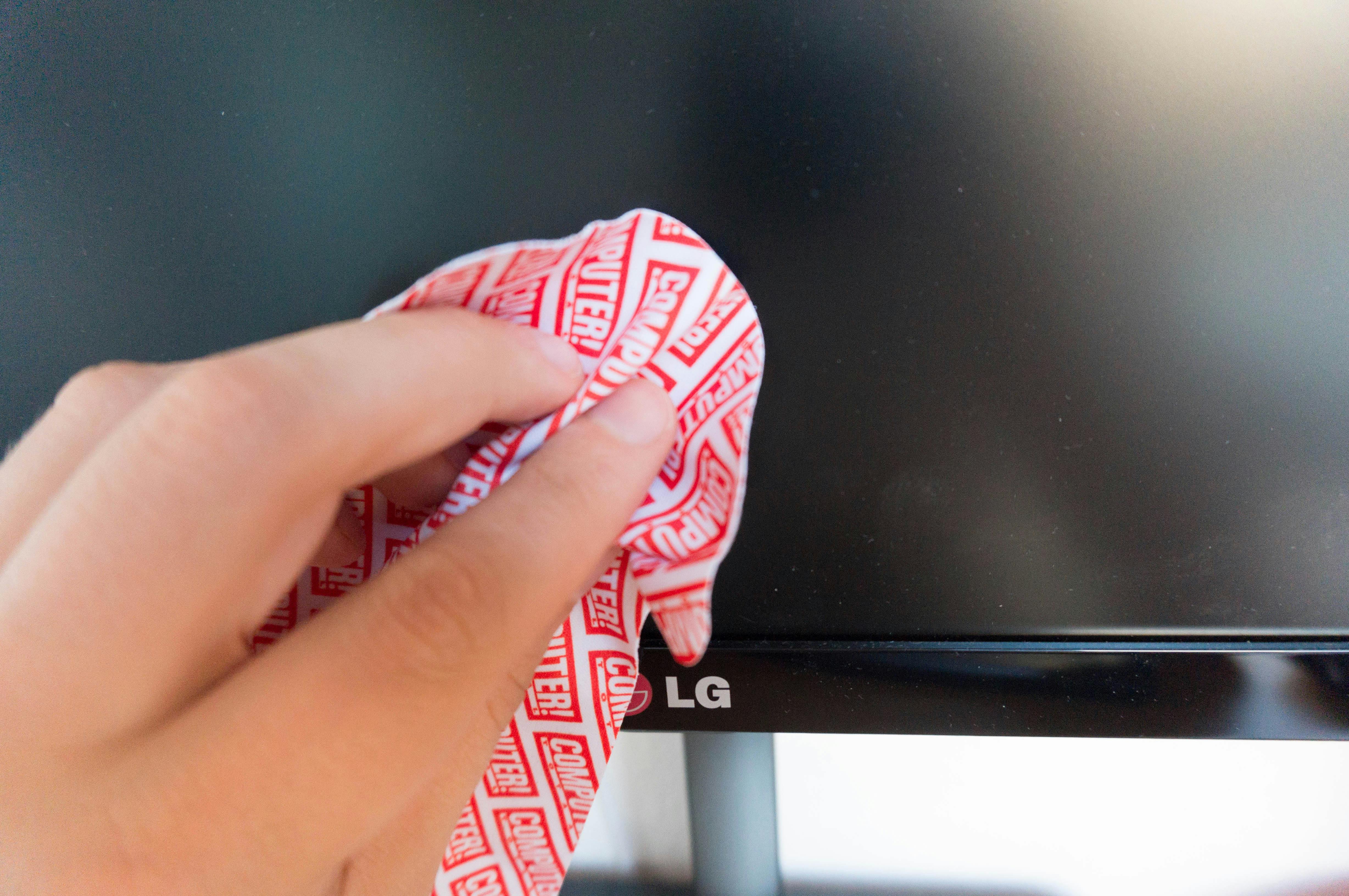 Spuit het middel niet direct op je scherm, maar breng een klein beetje aan op een microvezeldoek. De doek moet zeker niet doorweekt zijn. Vervolgens kun je in één beweging met de doek van links naar rechts over het scherm gaan.