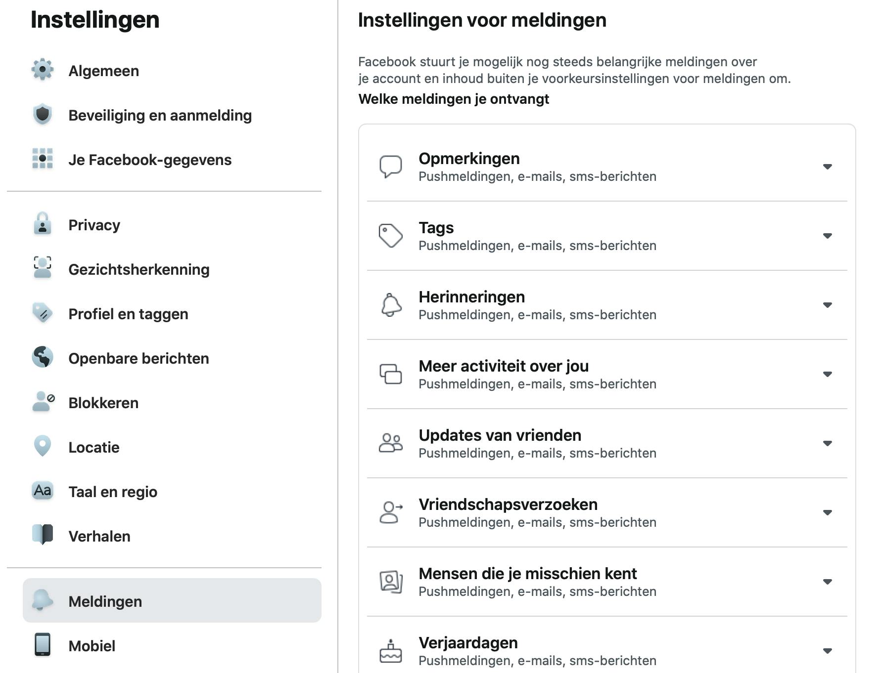 Waar haalt Facebook die suggesties vandaan? In de meeste gevallen gaat het om gemeenschappelijke vrienden en vrienden van vrienden. Maar het kan ook zijn dat je lid bent van dezelfde Facebook-groep of dat je getagd bent op dezelfde foto. Misschien hebben jullie een gemeenschappelijk netwerk zoals een school of werkgever? Op de desktopwebsite van Facebook kun je de functie Vriendensuggesties in je accountinstellingen uitschakelen. Nadat je bent aangemeld, klik je rechtsboven op het menupictogram. Dat is het pijltje dat omlaag wijst. Daar selecteer je in het vervolgkeuzemenu de optie Instellingen & privacy en vanaf daar ga je naar Instellingen. Daar kun je aan de linkerkant op de optie Meldingen klikken.