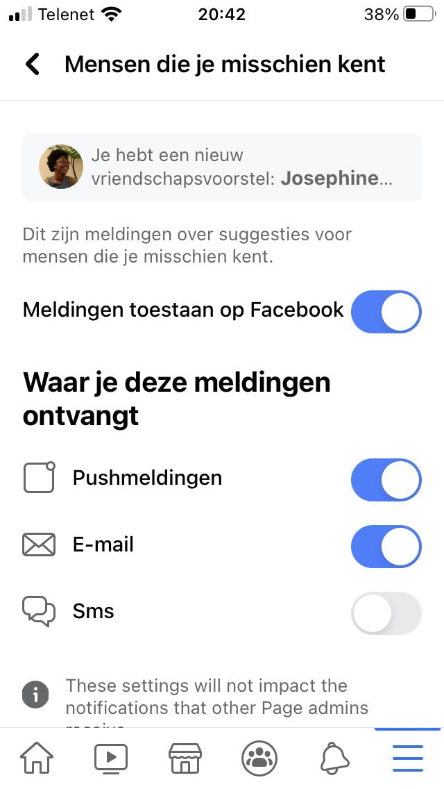 Eerst moet je beslissen of je de meldingen voor mensen die je misschien kent überhaupt wilt ontvangen. Als je deze optie actief laat dan kun je nog aangeven op welke manieren je deze meldingen wilt ontvangen: als pushmeldingen, per e-mail of per sms. Wil je alle vriendsuggesties stopzetten, dan gebruik je de schuifknop om die meldingen niet langer toe te staan. Hierdoor zul je voortaan zelf je vrienden moeten zoeken en toevoegen.