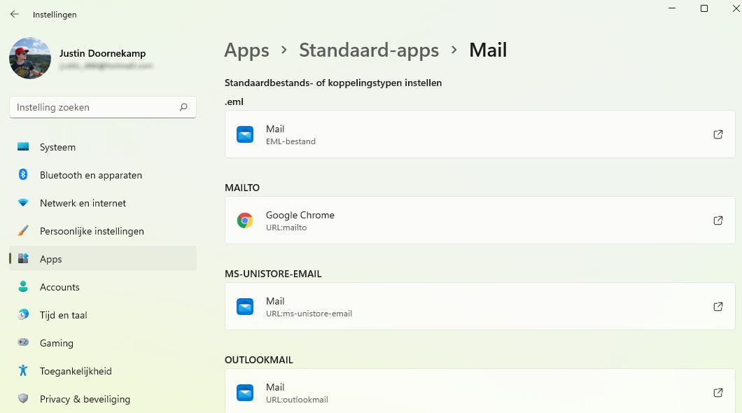 Onder .eml kun je op dezelfde manier als bij MAILTO de standaard-app veranderen, waarna .eml-bestanden dan in die app worden geopend.