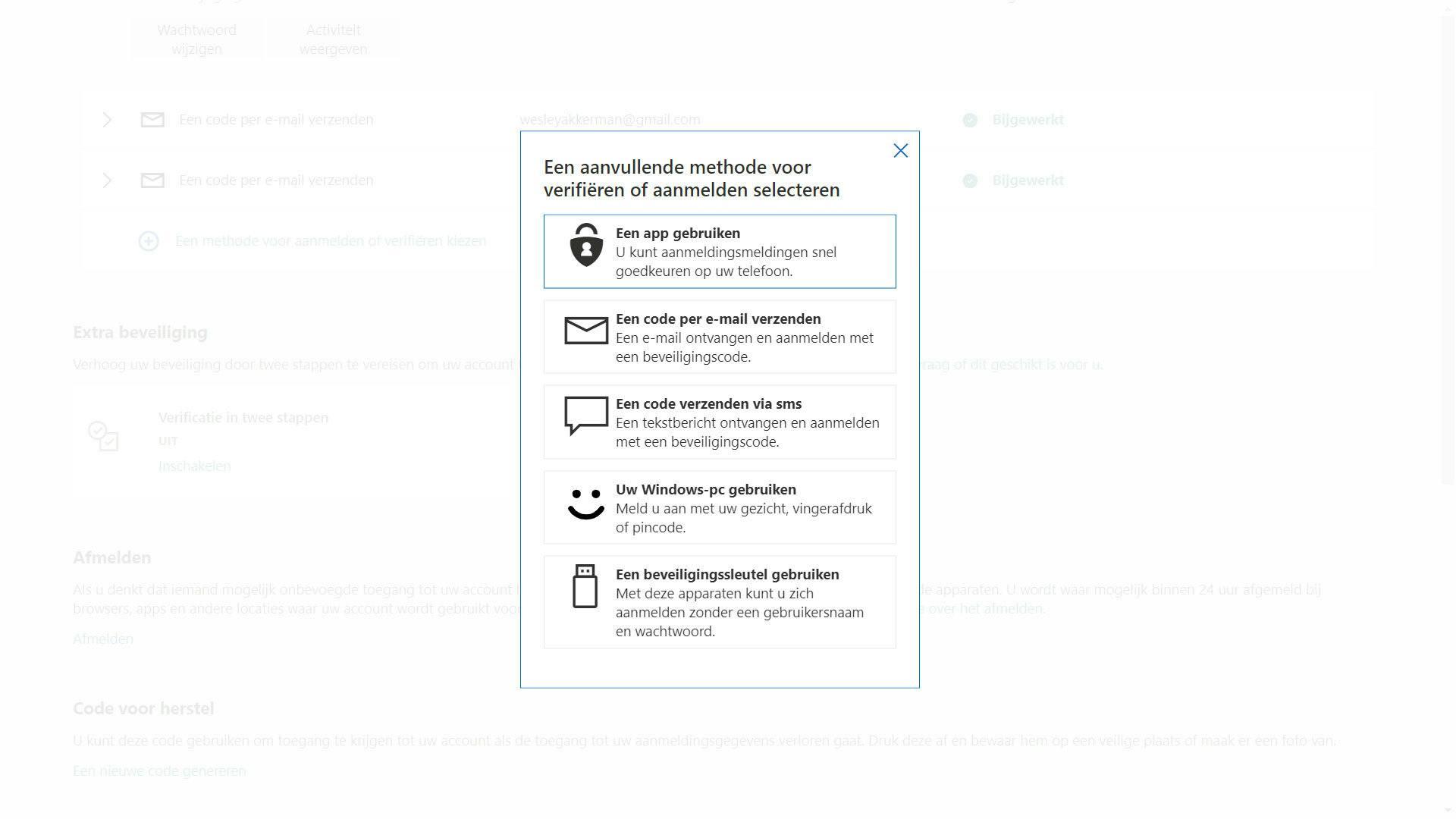 Nu je toch actief bent op de Beveiligen-tab van je Microsoft-account, kun je ook even wat andere contactgegevens toevoegen. Zo weet je zeker dat Microsoft je kan bereiken wanneer je bijvoorbeeld je wachtwoord ineens vergeten bent. Ga daarvoor naar Geavanceerde beveiligingsopties en druk op Een methode voor aanmelden of verifiëren kiezen. In het volgende venster kies je een manier waarop Microsoft je kan bereiken: via de mail, een sms of een app, bijvoorbeeld.
