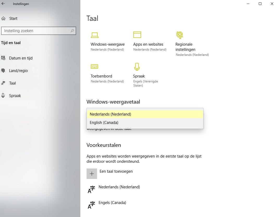 In Windows 10 is het wat moeilijker om de taal voor bepaalde apps aan te passen. Dit pas je doorgaans in de app zelf aan. Je kunt wel voor alle apps en websites een andere taal kiezen, terwijl de systeemtaal gewoon Nederlands blijft. Druk hiervoor in het Taal-menu op Apps en websites en zorg dat de taal waarin je apps en websites wilt zien bovenaan staat.