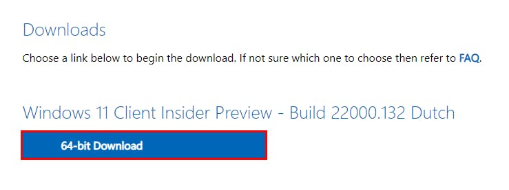 Kies uit de lijst voor de meest recente build van Windows 11, ten tijde van schrijven is dat versie 22000.132. Voor de meest stabiele versie kies je voor de ISO met de aanduiding Beta channel. De Dev Channel-versie is een wat onstabielere versie van Windows 11 met wat meer bugs en onvolkomenheden. Kies allen voor die versie als je puur de nieuwste functies wilt testen, maar een grotere kans op vastlopers of andere problemen voor lief neemt. Na het kiezen van de gewenste build klik je op de blauwe knop Confirm. Vervolgens moet je daaronder een taal kiezen bij Select the product language. Hier maakt het in principe niet uit welke taal je kiest, maar wij gaan in ons voorbeeld natuurlijk voor Nederlands (Dutch). Klik na je selectie wederom op Confirm. Je krijgt nu te zien welke versie en taal je hebt gekozen. Klik nu op de knop 64-bit download om de ISO te downloaden. In tegenstelling tot Windows 10 wordt een 32-bit-versie niet meer aangeboden voor Windows 11.