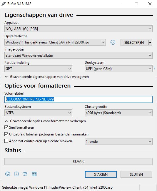 Controleer of de gegevens in Rufus overeenkomen met de volgende opties:
