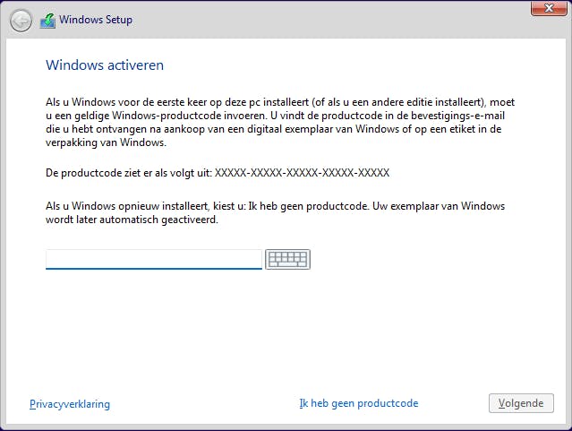 Installeer je een previewversie van Windows 11, dan hoef je hier niets in te vullen. Installeer je de uiteindelijke versie van Windows 11, weet dan dat je hier ook een productcode van Windows 10 en zelfs Windows 7 kunt invullen: Microsoft ziet de Windows 11-installatie dan als upgrade van een oudere Windows-versie, ook al installeer je hem helemaal schoon. Normaliter krijg je ook de vraag welke versie van Windows 11 je wil installeren: Home of Pro, maar als de opgegeven productcode is geaccepteerd, wordt aan de hand van die code direct de daaraan gekoppelde versie geïnstalleerd.