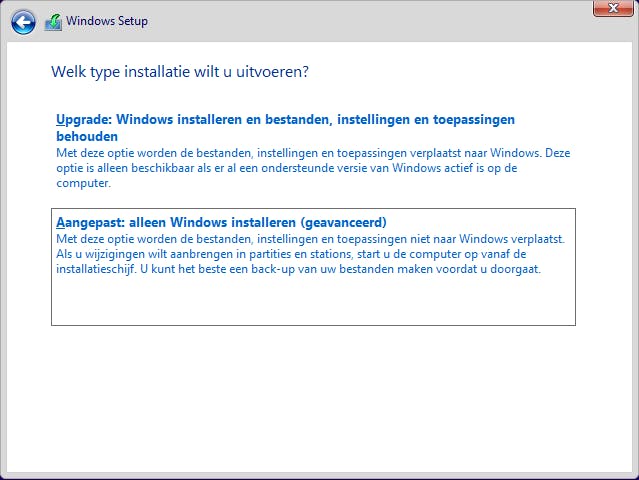 In het volgende scherm wordt nu gevraagd of je een upgrade wilt uitvoeren, of een aangepaste installatie wilt doen. Wij willen helemaal met een schone lei beginnen en kiezen voor de tweede optie: Aangepast: alleen Windows installeren (geavanceerd).