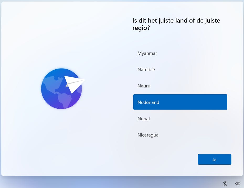In dit deel van de installatie van Windows 11, ook wel bekend als OOBE of Out of the Box Experience, komt het onderdeel aan bod waarin je een eerste gebruikersaccount aanmaakt en wat andere zaken instelt, zoals het toetsenbord, land en – sinds Windows 11 – ook een computernaam. Dit deel van de installatie krijg je ook te zien wanneer je voor het eerst een nieuw-gekochte Windows 11-computer opstart. Opvallend zijn de grote lettertypen en knoppen die nu worden gebruikt. Dat heeft te maken met het feit dat Microsoft de setup van Windows 11 zo gebruikersvriendelijk mogelijk wilde maken voor gebruikers die beschikken over een computer met een aanraakscherm. De eerste vraag is in welk land je je bevindt, selecteer het land en bevestig met de knop Ja. Vervolgens wordt gevraagd welke toetsenbordindeling je wilt gebruiken. Ook hier geldt dat voor de meeste Nederlandse Windows-gebruikers de indeling Verenigde Staten (Internationaal) de meestgebruikte is.