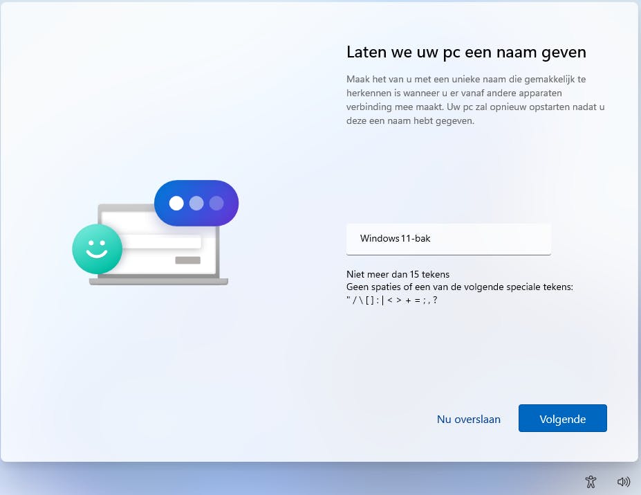 Na het instellen van het toetsenbord checkt Windows 11 nog of er nieuwe updates zijn verschenen, en als dat het geval is, worden deze later tijdens de installatie toegepast. Daarna volgt een nieuw scherm: er wordt gevraagd om de computer alvast te voorzien van een naam. Je bent niet verplicht om dit te doen, want via de knop Overslaan kun je door naar het volgende scherm.