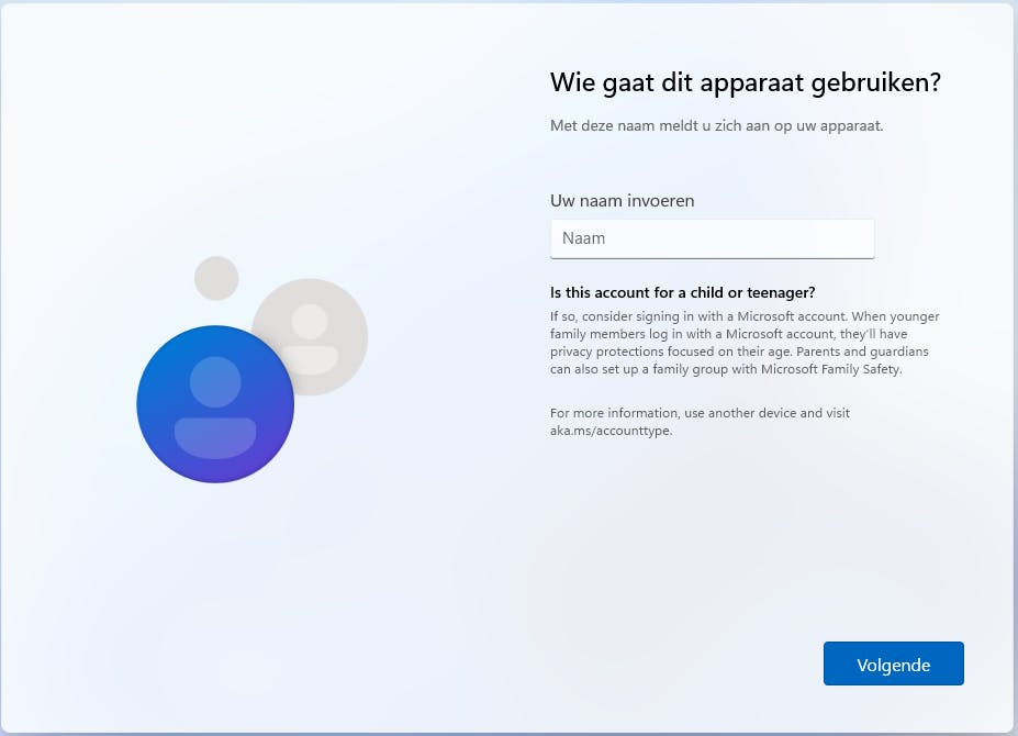 Nadat je je naam hebt opgegeven, word je gevraagd een account aan te maken. Nu is hier veel over te doen geweest: Microsoft verplicht je namelijk om een Microsoft-account te gebruiken. Het is niet meer mogelijk om een standaard (offline)-account tijdens de installatie in te stellen. Dat kan wel achteraf als je eenmaal met een Microsoft-account bent aangemeld; in Windows 11 voeg je dan een lokaal administrator-account toe, log je ermee in en verwijder je weer het Microsoft-account. Kortom, een hoop gedoe. Maar er is een snellere omweg: als er namelijk geen internetverbinding gevonden wordt, dan kun je je wel aanmelden met een lokaal account. Tijdens de installatie moet je er dus voor zorgen dat je geen verbinding maakt met bijvoorbeeld je wifi-netwerk (waar om gevraagd wordt), en als je een netwerkstekker hebt aangesloten, je deze eruit haalt.