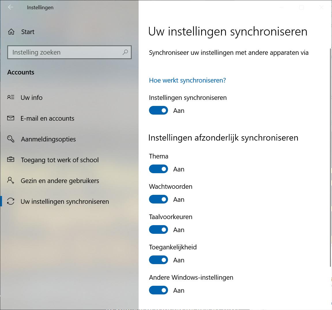 Windows 10 gebruikt het Microsoft Account (waarmee je je aanmeldt) ook om het uiterlijk van de computer te synchroniseren met andere computers waarop je je met hetzelfde account aanmeldt. Zo beschik je op elke computer over dezelfde bureaubladachtergrond, maar ook over dezelfde kleurenset en -thema’s. Deze synchronisatie is gelukkig niet verplicht: je kunt de synchronisatie uitschakelen als je hieraan geen behoefte hebt en bijvoorbeeld op elke computer een ander thema wilt toepassen. Kies bij Persoonlijke instellingen voor Achtergrond en klik op Uw instellingen synchroniseren (rechts in het venster). Windows synchroniseert meerdere onderdelen, waaronder het gebruikte thema, maar ook wachtwoorden en taalvoorkeuren. Gebruik de schuifjes onder Instellingen afzonderlijk synchroniseren om per onderdeel aan te geven of het mag worden gesynchroniseerd. Wil je dat er helemaal niet meer wordt gesynchroniseerd, zet dan de schuif op Uit bij Instellingen synchroniseren.